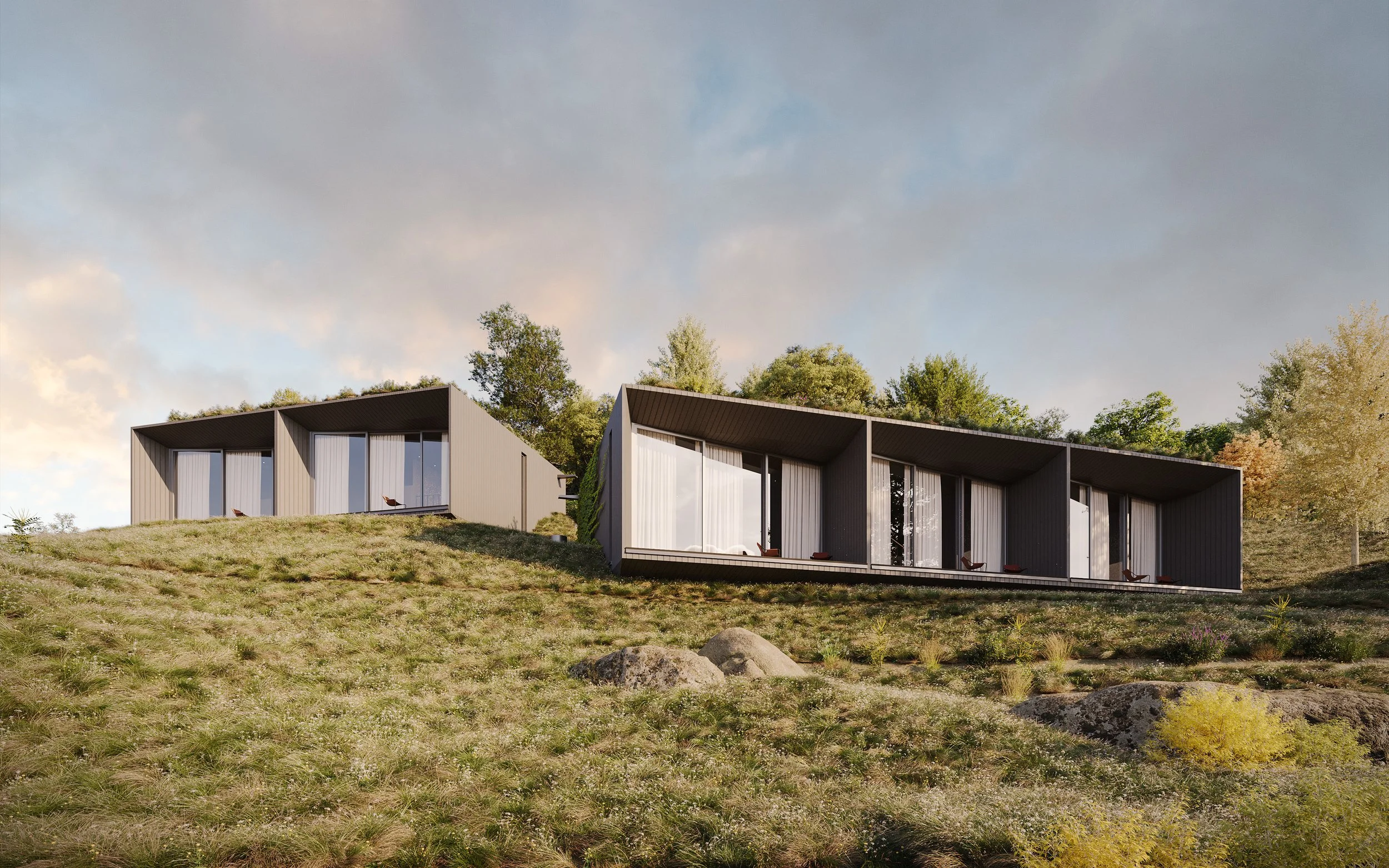 The core vision is to create a symbiotic relationship between the built form and the steep, rugged topography. The design embraces the principles of Biomimicry and Eco-integration, positioning the structures not as intrusions, but as discrete elements nestled into the hillside. This approach prioritizes minimal site disturbance and maximizes the occupants' connection to the surrounding environment.